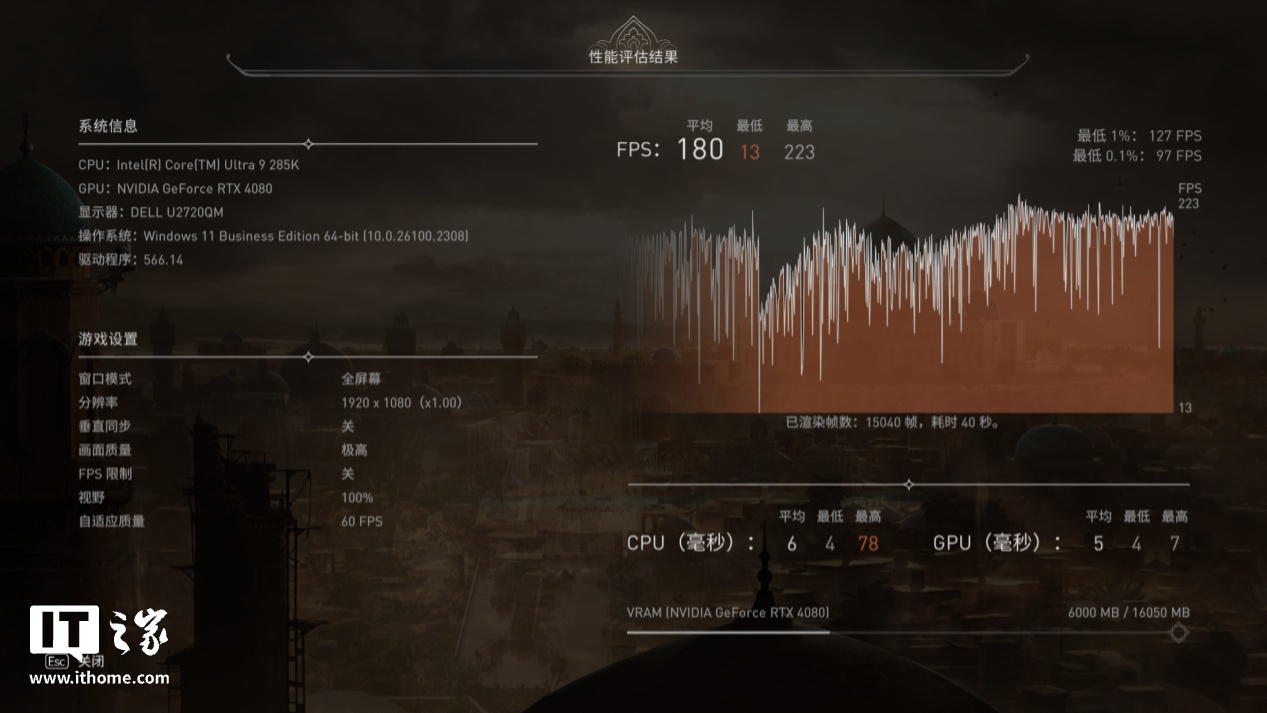 第五款是《刺客信条:幻景》,选择 1080P 分辨率 + 极高画质,并关闭动态模糊,运行游戏自带基准测试。酷睿 Ultra 9 285K 游戏平均帧数为 180 帧,1% Low 帧 127 帧。