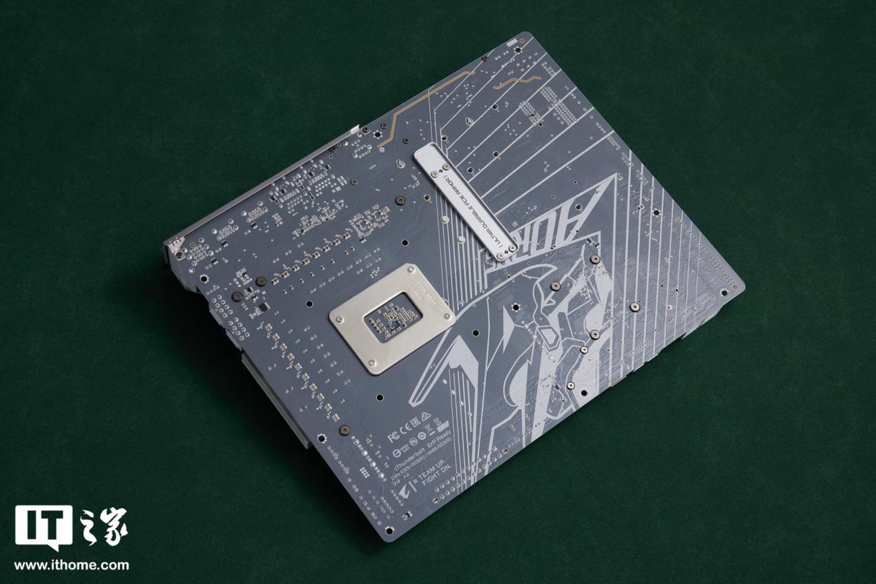 技嘉 Z890 AORUS PRO ICE 主板的主板背部为灰色涂装,印有 AORUS LOGO 以及线条装饰。并且,主 PCIE 背面有金属加固,有助于提升主板抗弯性。