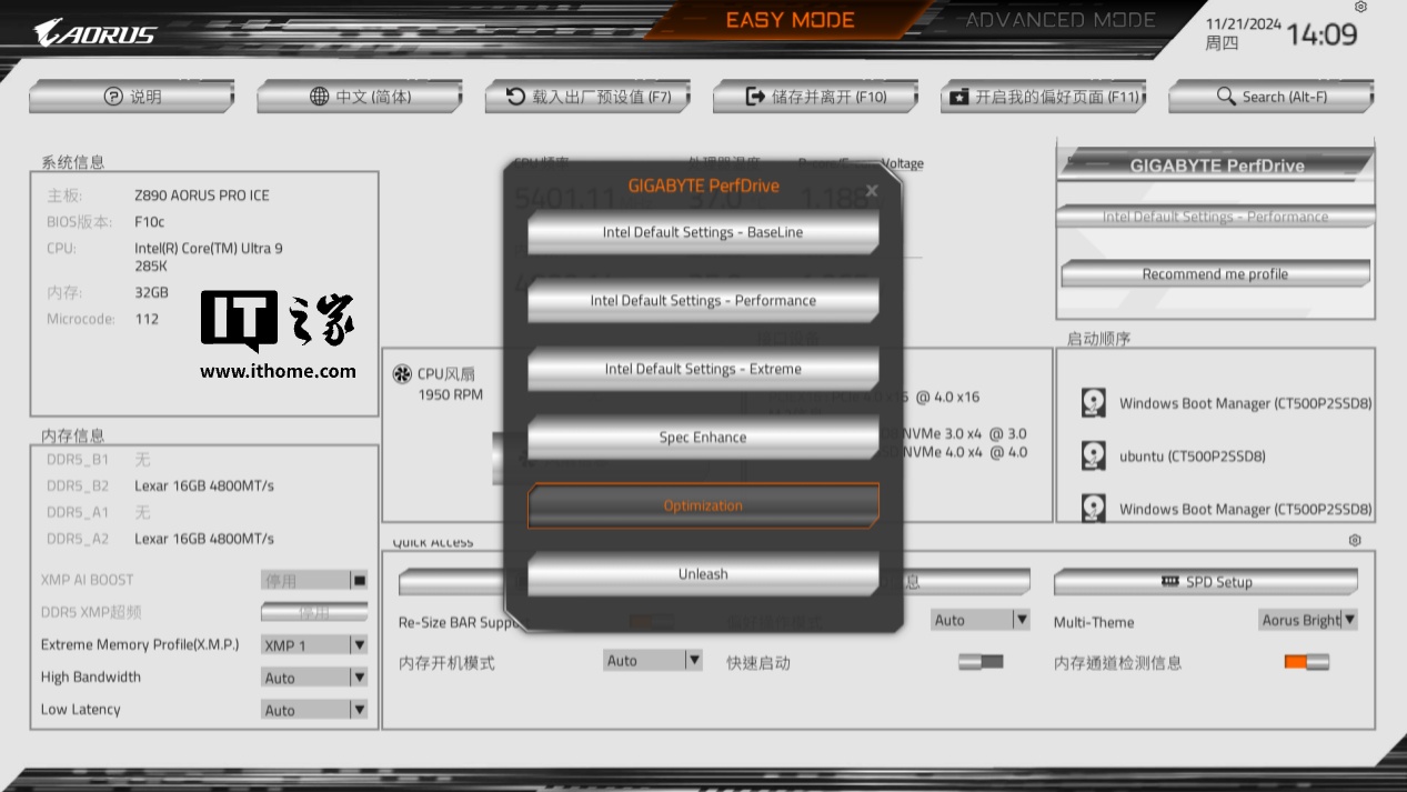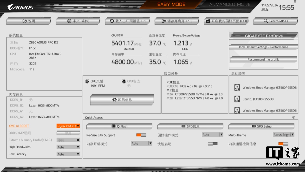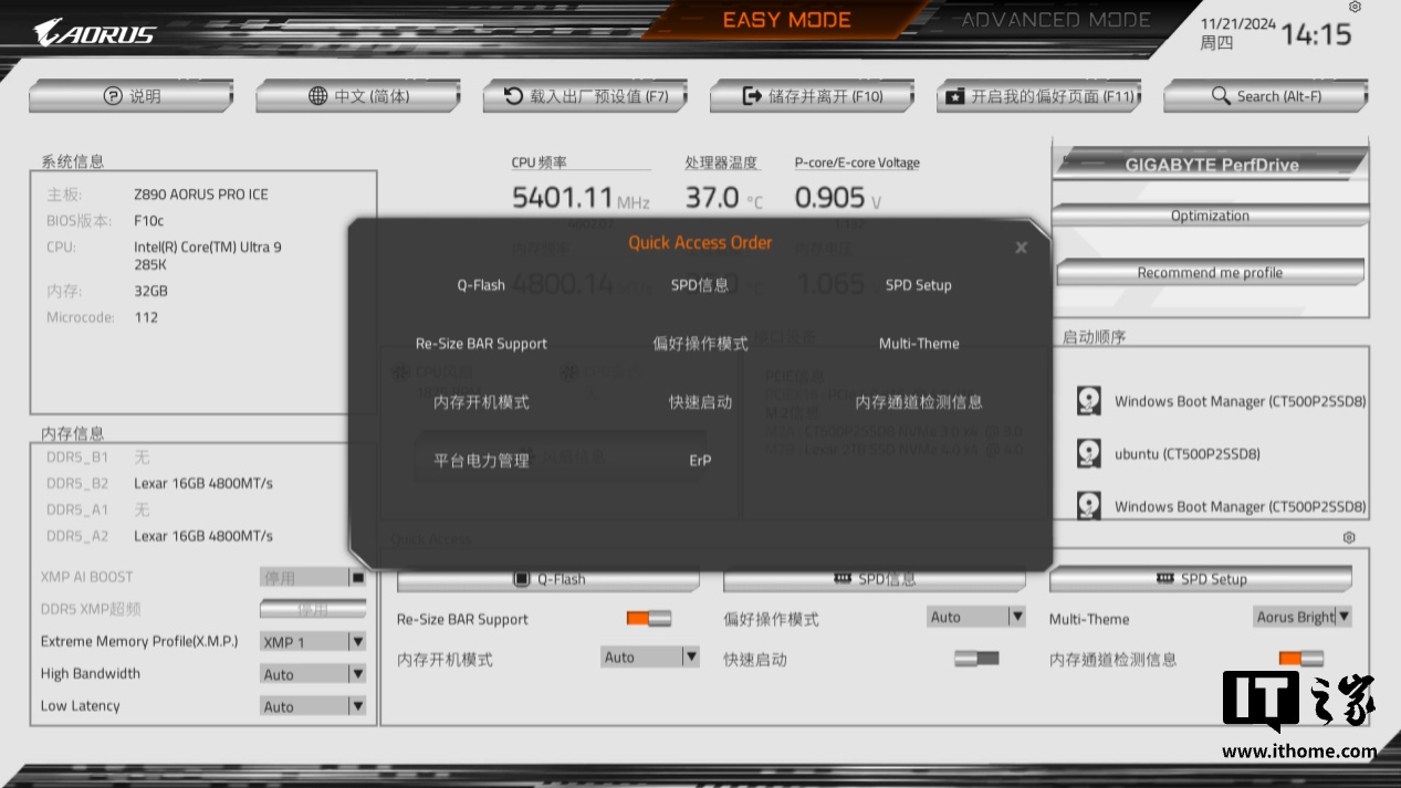 技嘉 Z890 AORUS PRO ICE 主板的 UC BIOS 也做了升级,界面根据用户的常用设置做了调整。其默认的 BIOS 主题为 AORUS Bright,采用银色背景 + 橙色主色设计,与主板的颜色很搭。