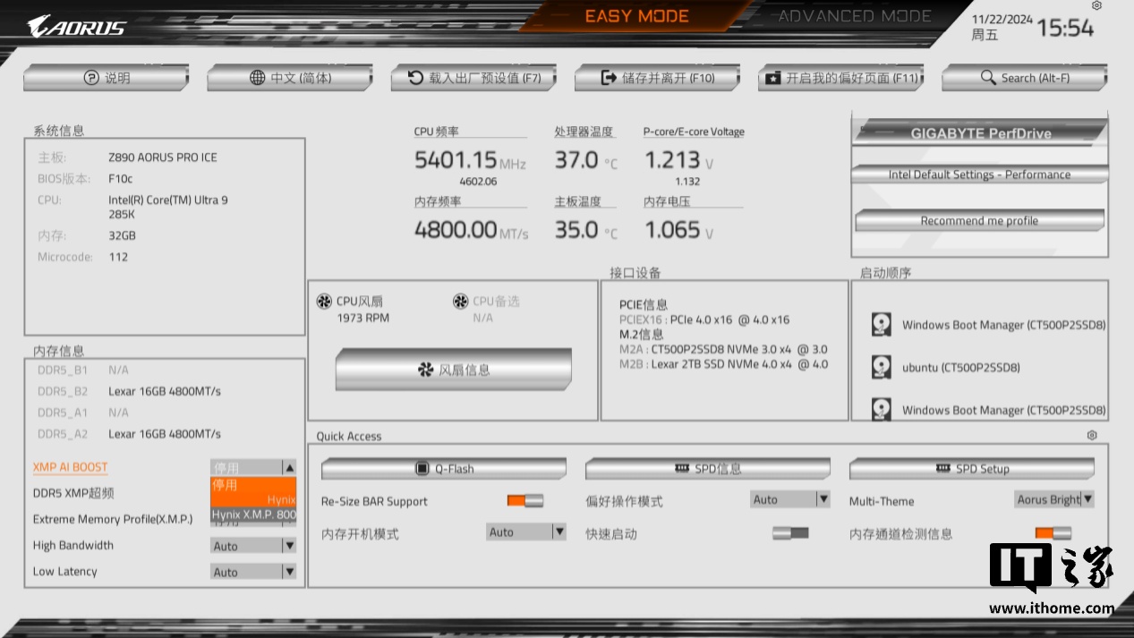 内存方面,技嘉 Z890 AORUS PRO ICE 主板最高支 9600MT/s 的内存频率规格,并支持 AI D5 黑科技 2.0 自动超频,只需在系统中使用 AORUS AI SNATCH 超频法宝进行实时分析,随后即可进入 BIOS 中设置 XMP AI BOOT 超频。