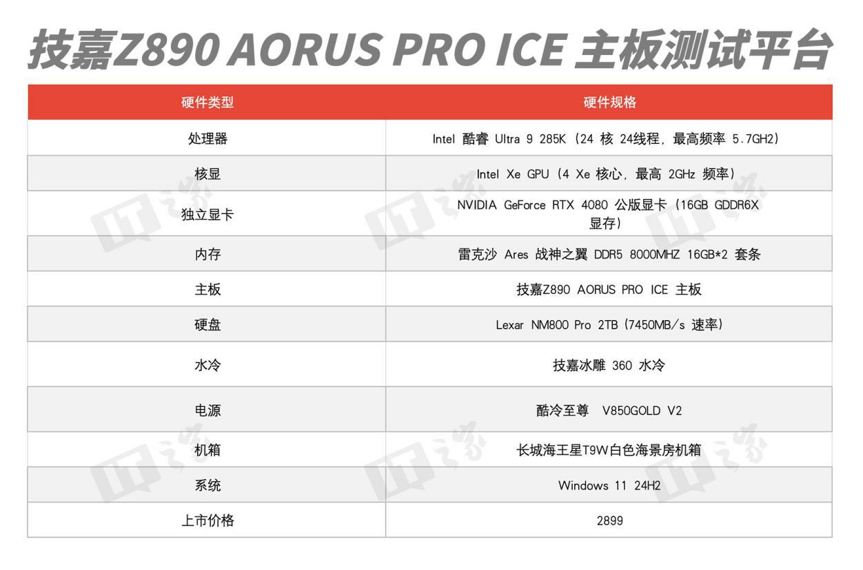 随着 10 月 24 日,英特尔酷睿 Ultra 200 系列处理器的正式发售,各家厂商的 Z890 新品主板也纷纷亮相。IT之家收到了技嘉 Z890 AORUS PRO ICE 主板,其采用全白配色,支持 D5 黑科技 2.0 内存 AI 超频。那么这款主板的表现究竟如何,一起来了解一下吧。为了更好地展现技嘉 Z890 AORUS PRO ICE 主板的性能,我们搭建了以上这套测试平台,可供参考。