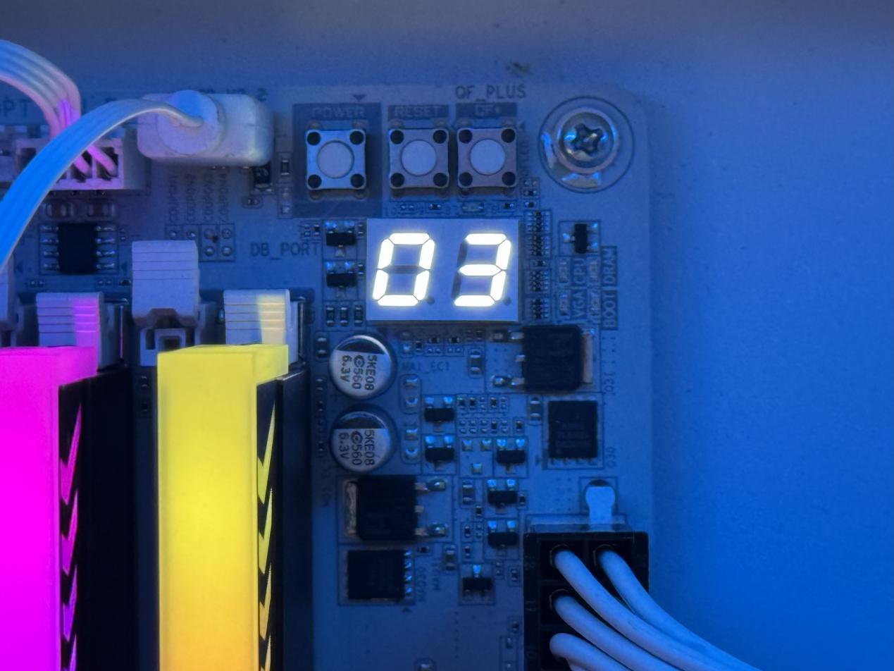 内存右侧还提供了 80 灯、诊断灯以及一组快捷的控制按钮,让用户在装机时能更好判断和排查硬件故障问题。而三枚控制按钮的用途则更加丰富,最左侧的按钮为电源按钮,中间的为多功能按钮,最右侧则是 QF-PLUS 主板 BIOS 更新按钮。其中多功能不仅可以键关闭主板 RGB 灯光,还能实现直接进去 BIOS、安全模式等功能。