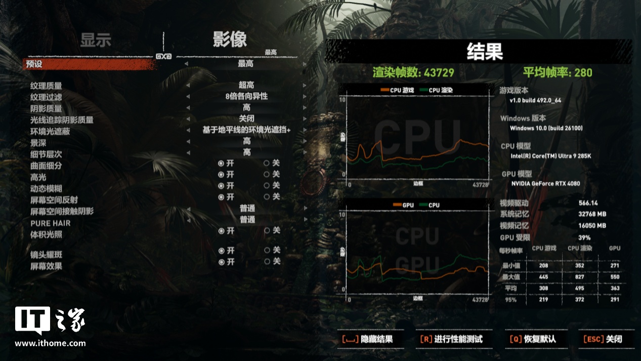 第三款《古墓丽影:暗影》,选择 1080P 分辨率 + 高画质运行游戏自带基准测试,酷睿 Ultra 9 285K 游戏平均帧数为 280 帧,1% Low 帧 219 帧。