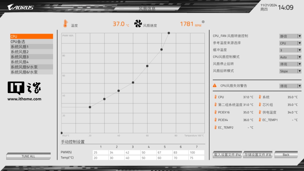 虽说我们可以直接在技嘉控制中心进行 AIO 风扇控制,但 Linux 等其他系统的用户调整起来可能就不是那么便捷,现在在 UC BIOS 中添加了 AIO 风扇控制功能,不用额外的控制软件也可以快速调整风扇的温度转速曲线。