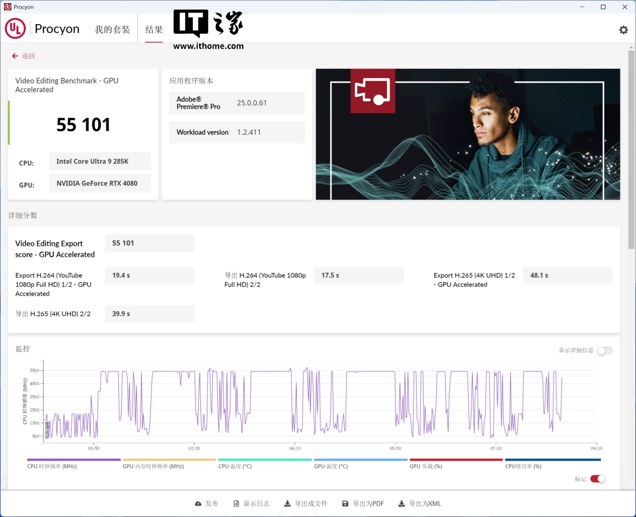 Procyon 的视频编辑基准测试可以调用 Adobe Premiere Pro,对视频进行编辑调整并导出 H.264 编码的视频,其最终得分为 55101。
