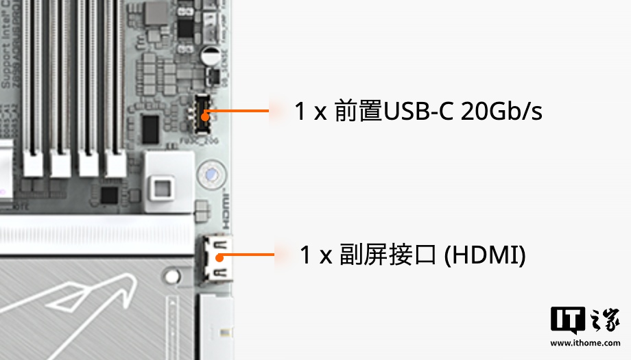 另外技嘉 Z890 AORUS PRO ICE 还提供了 1 个前置 USB-C(20Gb/s)插槽、1 个 HDMI 副屏接口,进一步增强装机的可玩性。