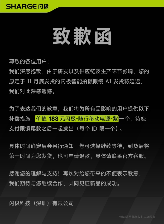 闪极今日发布“致歉函”称,由于研发以及供应链及生产环节影响,原定于 11 月底发货的闪极智能拍摄眼镜 A1 发货将延迟。将为所有受影响的用户补偿价值 188 元闪极-随行移动电源-紫一个,待用户支付眼镜尾款之后一起发出(每个 ID 限一个)。