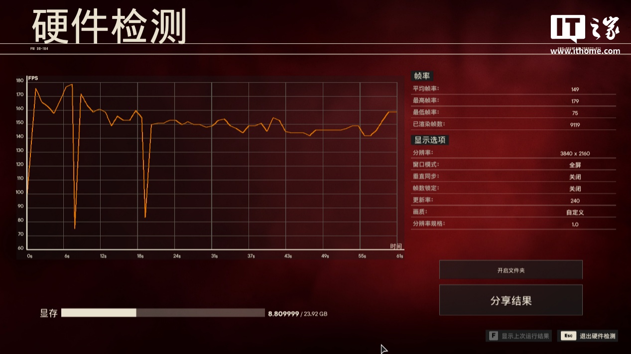 这款游戏我们做了一组对比测试,第一次选择 4K + 最高画质,开启 FSR 并选择质量档位,运行游戏自带基准测试,平均帧数为 149 帧,1% Low 帧为 80 帧。