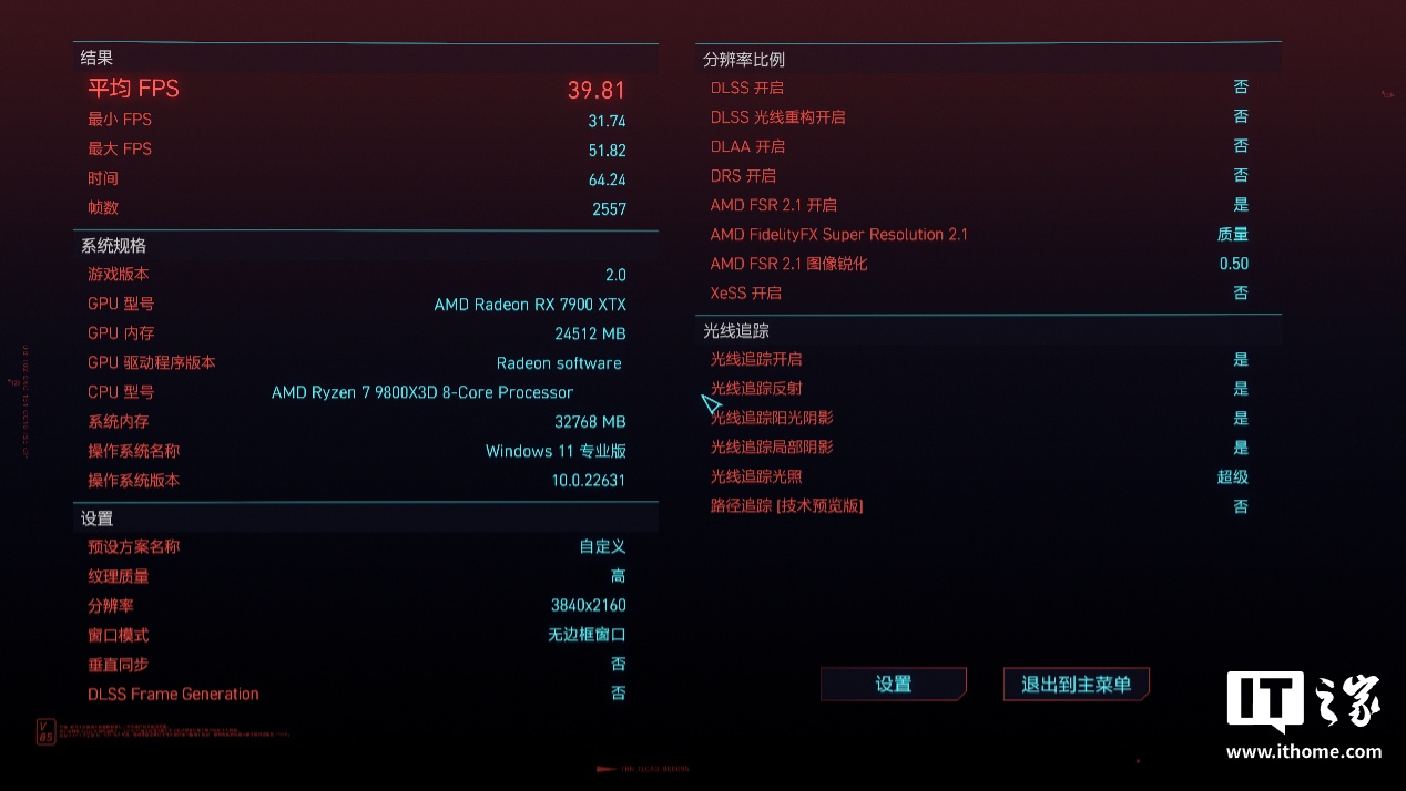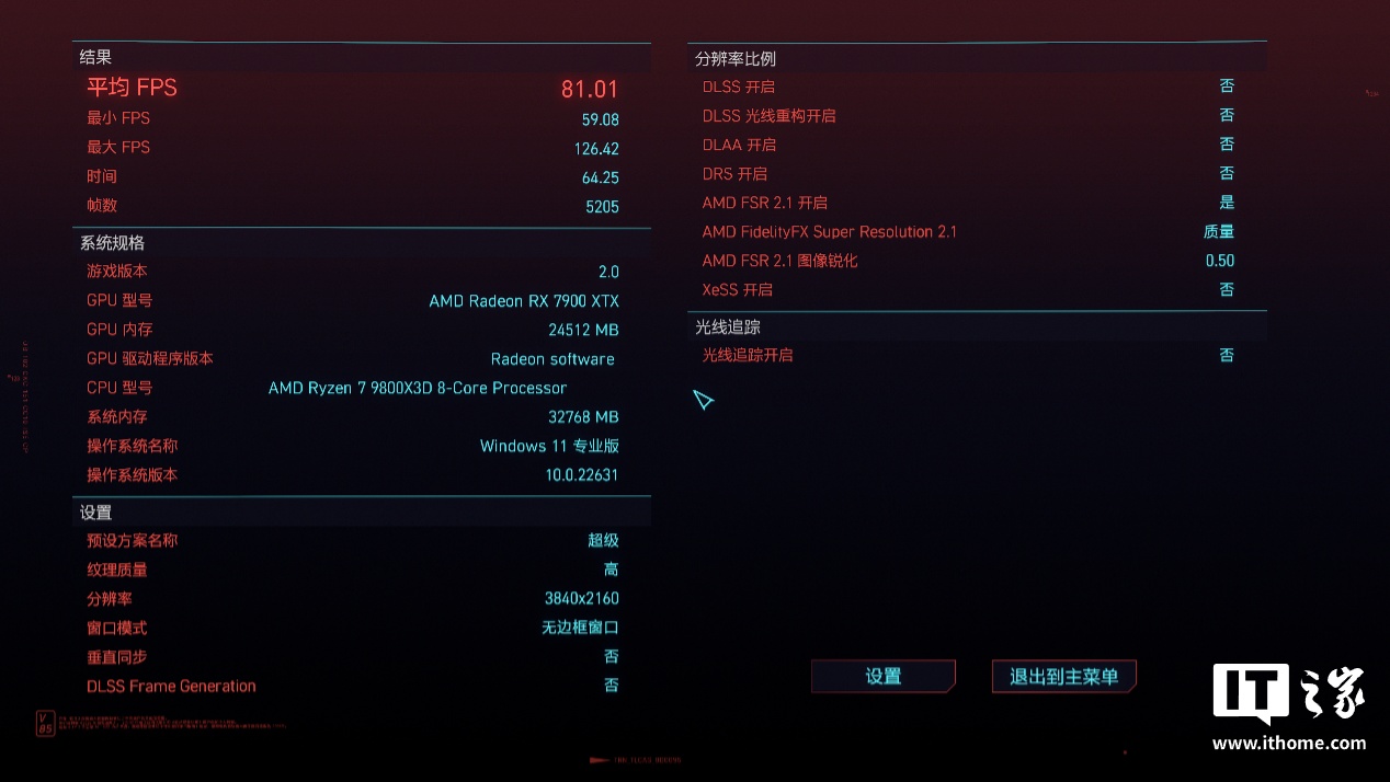 《赛博朋克:2077》也是一款对显卡压力巨大的游戏,在 4K 分辨率 + 超级光追画质的条件下,FSR2 会自动开启,并设定在质量档,运行自带基准测试,游戏平均帧数只有 39.8 帧;切换到超级画质后,游戏平均帧数提升到 81 帧,可以流畅游玩。