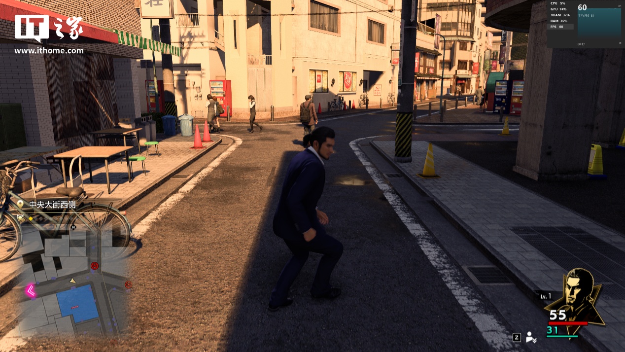 第二次我们关掉 FSR 相关选项,其它设置保持不变,此时游戏平均帧数立马掉到了 60 帧,而且《人中之龙 8》的游戏场景多为箱庭式设计,帧数波动非常小,虽说 60 帧刚好卡在了及格线上,但游戏平均帧数只有开启 FSR 3 的一半,差距还是很明显的。