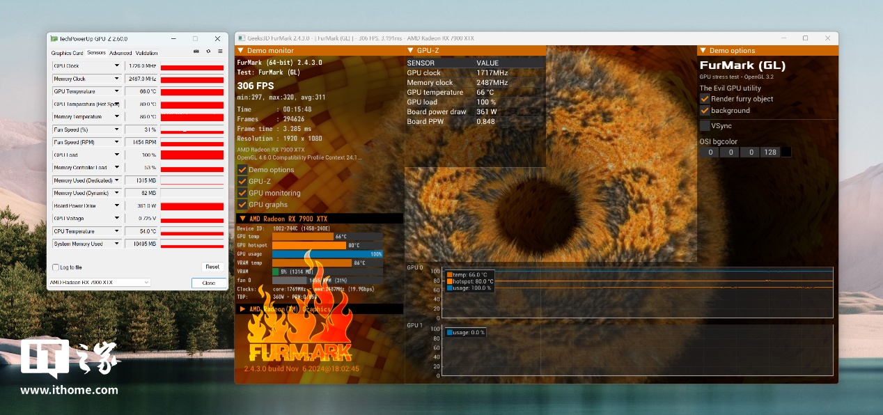 首先来看烤机,通过 FurMark 烤机软件单烤 15 分钟后,技嘉 Radeon RX 7900XTX 魔鹰显卡的温度只有 66°,显存温度略高一些,来到了 86°,不过也在正常范围内。此时显卡的功耗达到了 361W,GPU 核心频率则是 1726MHz,这部分的表现有些保守。