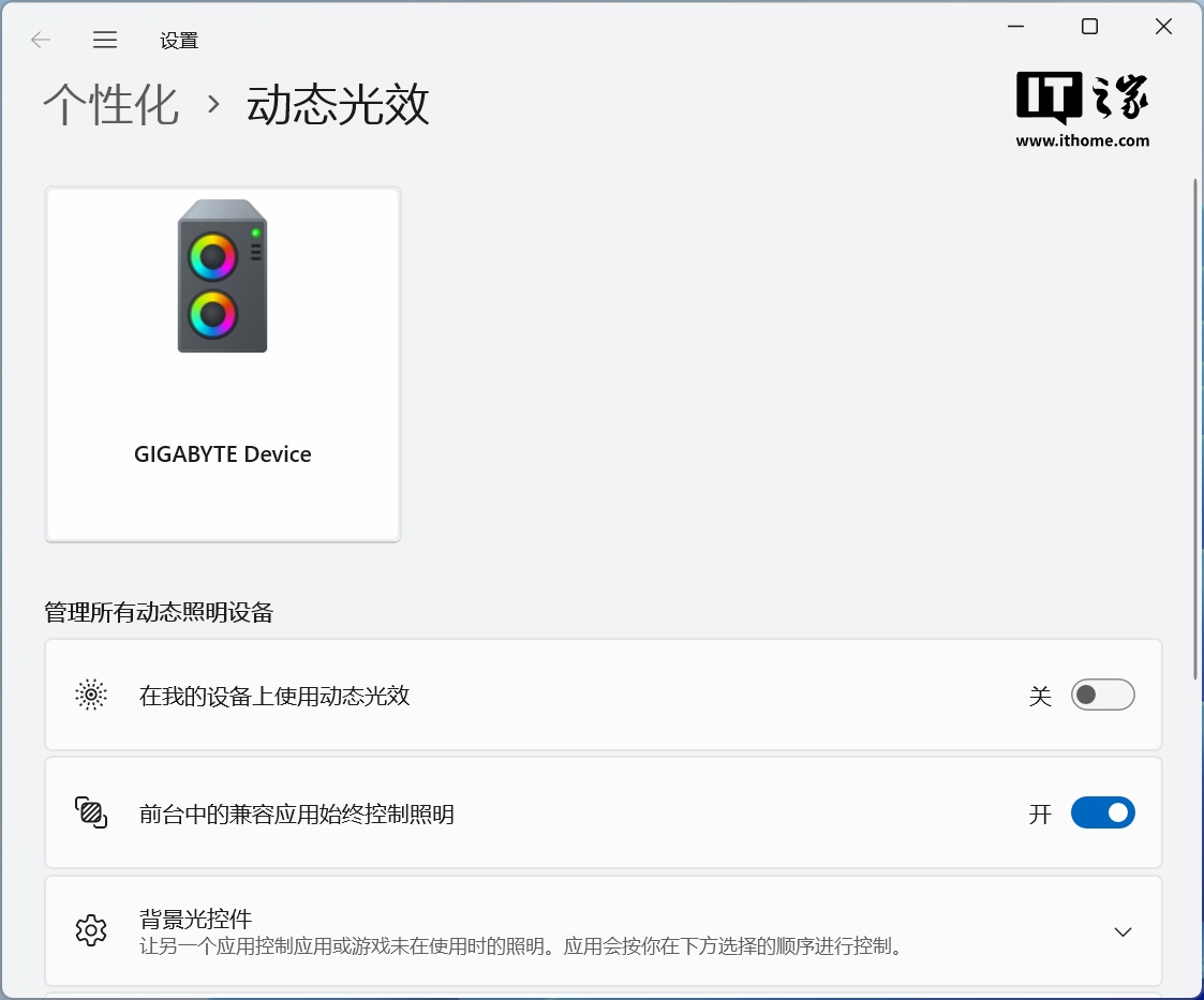现在技嘉智能管家和硬件还支持了微软的动态光效功能,可以随时通过 Windows 系统设置中的个性化菜单找到并开启,独立实现灯效联动。