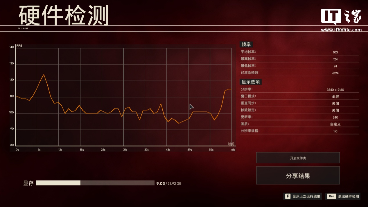 第二次我们关闭 FSR 选项,其它条件保持不变,运行游戏自带基准测试,平均帧数为 124 帧,1% Low 帧为 76 帧。无论是否开启 FSR,平均帧数都超过了 120 帧。