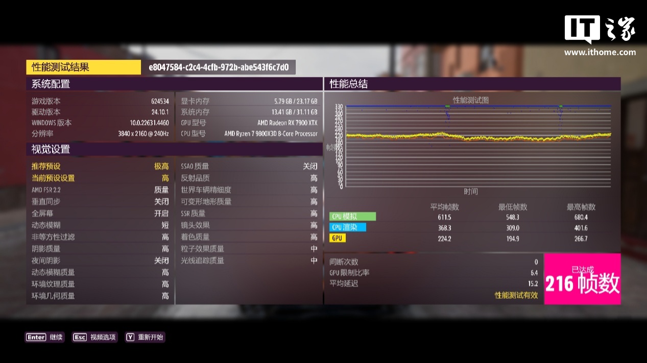 《极限竞速:地平线 5》的优化非常不错,所以在 4K 分辨率下表现是非常稳定的。进入有游戏我们选择 4K 分辨率 + 高画质,开启 FSR2 并选择质量,游戏平均帧数为 216 帧,1% Low 帧 147 帧。