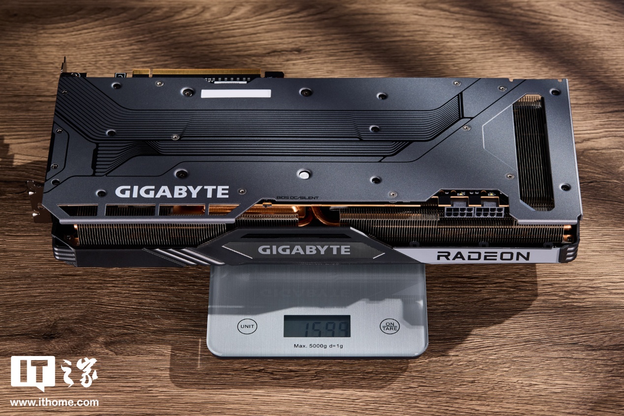 重量方面经过IT之家上秤实测,技嘉 Radeon RX 7900XTX 魔鹰显卡的裸卡来到了 1.59kg,在类似定位的显卡中也算较轻的一款。