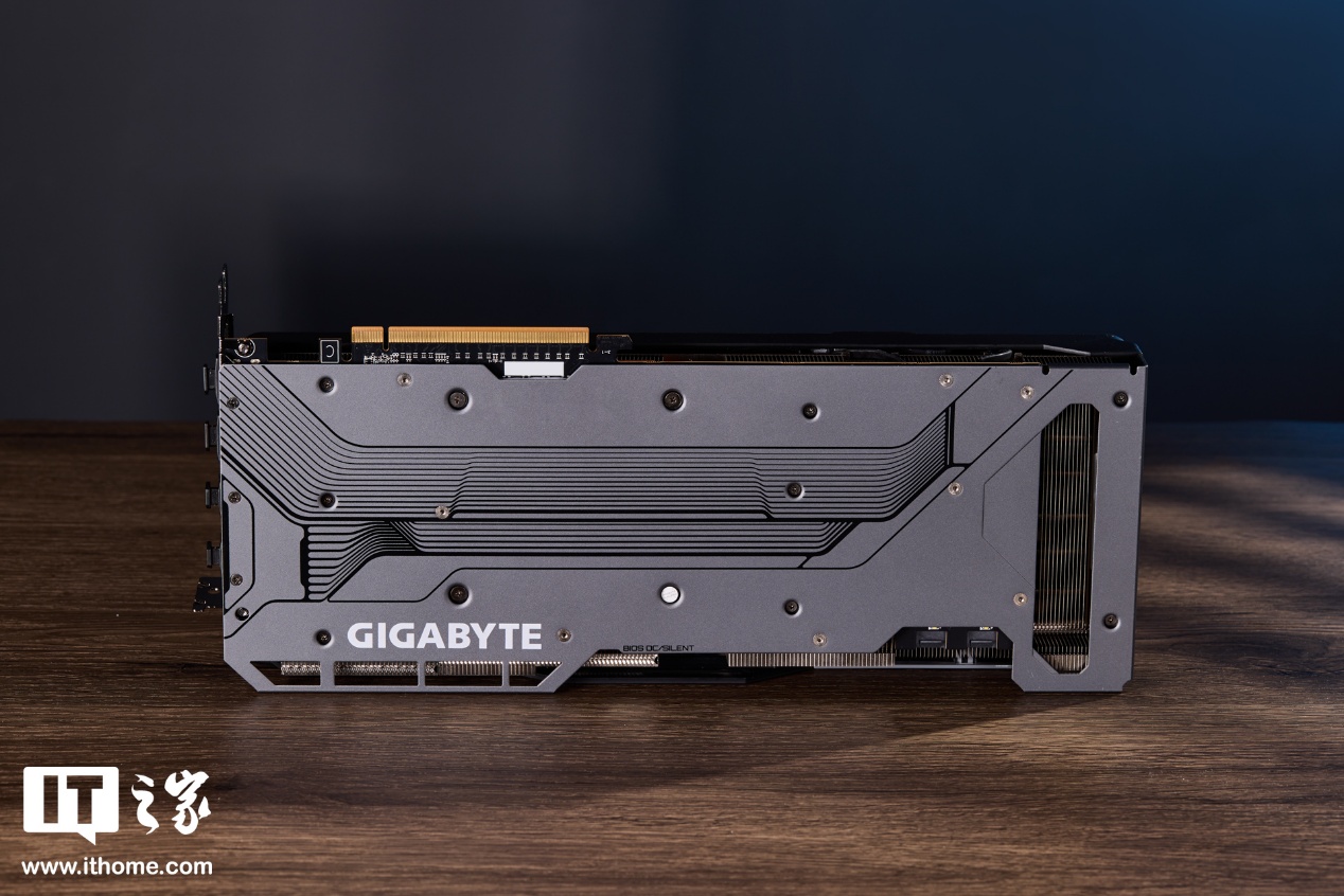 背板方面,技嘉 Radeon RX 7900XTX 魔鹰显卡则采用了一体成型的银灰色铝合金材质,可以更好保护显卡的 PCB,增加卡身刚性。背板表面印有一些黑色的硬核风纹理装饰,充满了机械工业风质感。背板的右侧没有采用主流的单个大面积进气口,而是在下方和右侧开了三组不同大小形状的开口帮助气流循环。