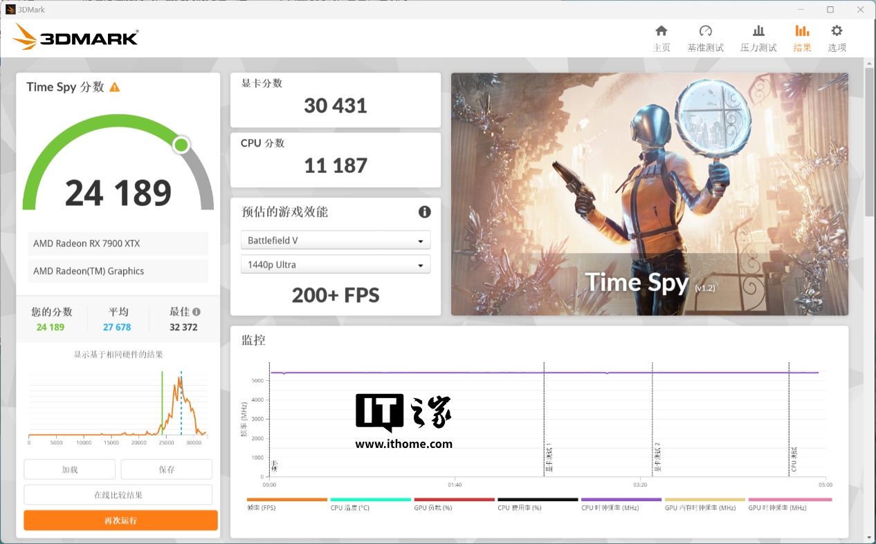 在 3D Mark Time Spy 测试项目中,技嘉 Radeon RX 7900XTX 魔鹰显卡拿到了 30431 分的显卡分数。
