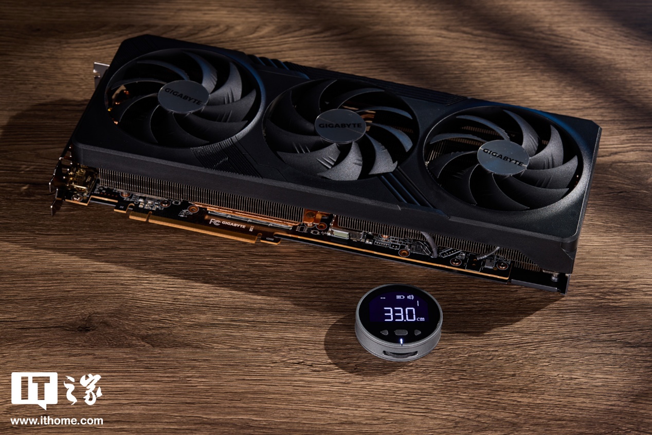 尺寸方面,技嘉 Radeon RX 7900XTX 魔鹰显卡的长宽和厚度分别为 331*138*55mm,IT之家实际测量起来还要更加修长和更薄一点。