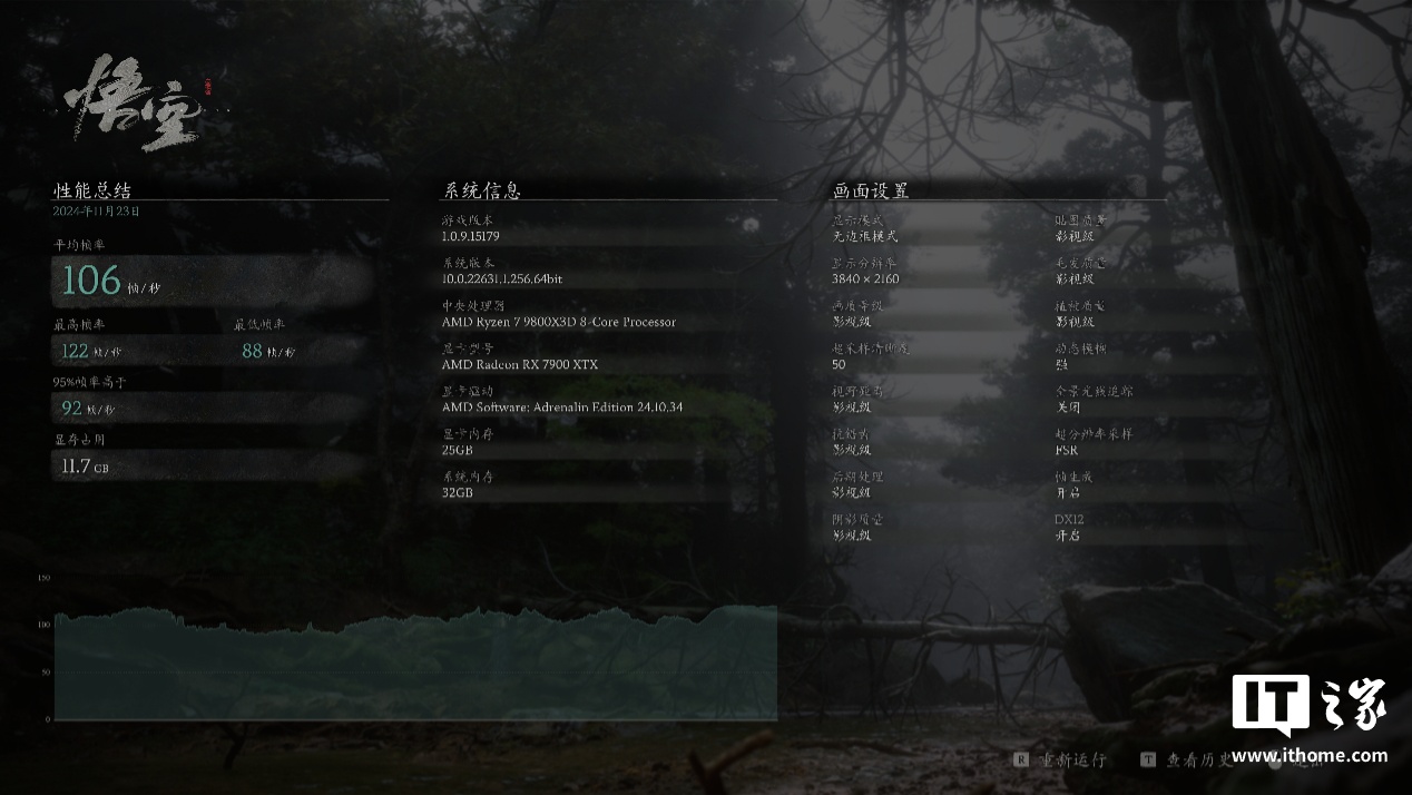 《黑神话:悟空》对显卡性能的挑战非常大,是一款典型的“众生平等”游戏。游戏中我们选择 4K 分辨率 + 影视级画质,关闭光追并开启 FSR 超分辨率采样以及帧生成,超采样清晰度设置为 50,运行游戏自带基准测试工具,此时的游戏平均帧数为 106 帧,1% Low 帧 88 帧。