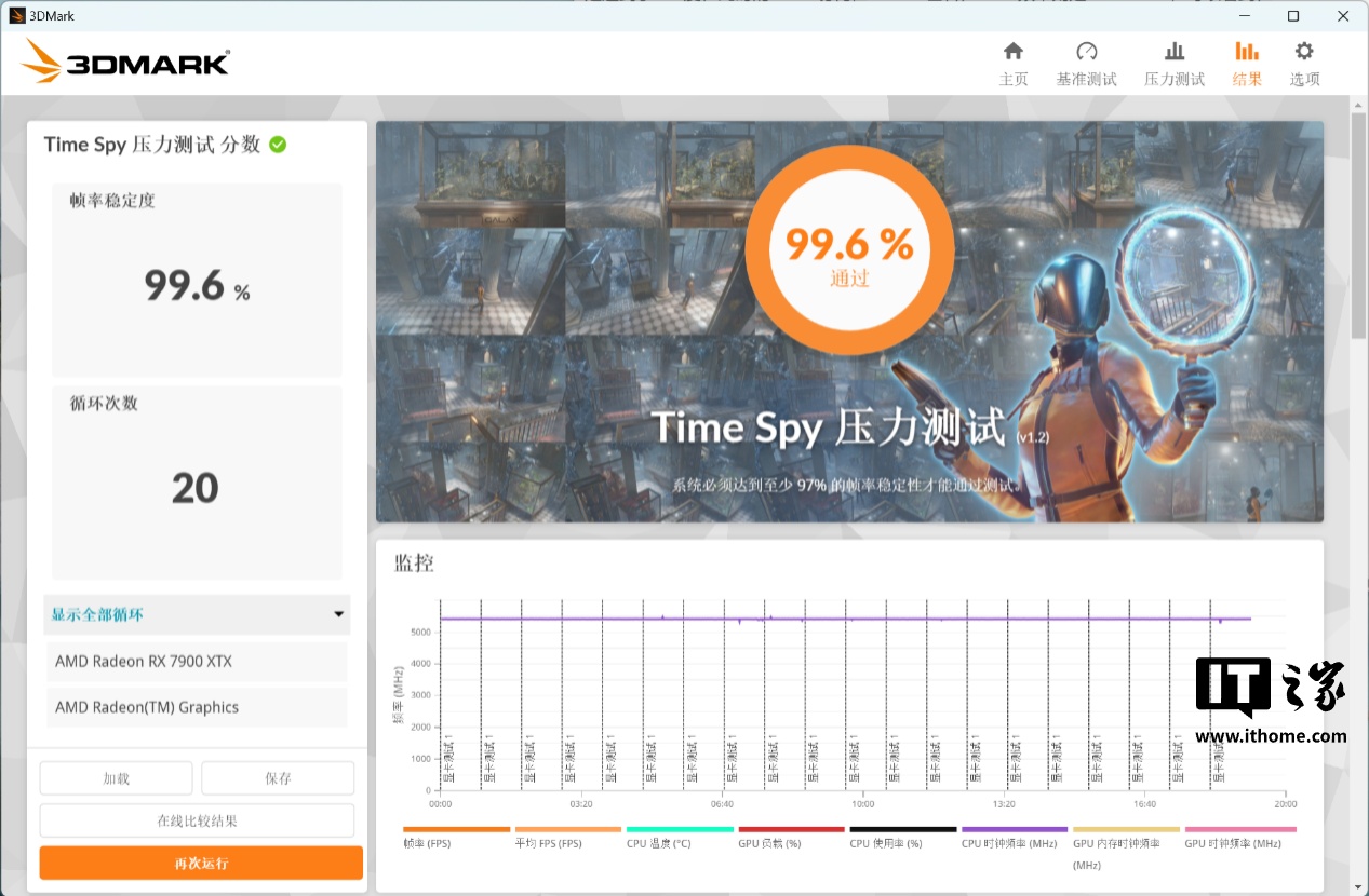 我们还对技嘉 Radeon RX 7900XTX 魔鹰显卡做了 Time Spy 压力测试,这项测试可以体现显卡长时间的高负载运行稳定性,最终成绩需大于或等于 95% 才算合格。从图表上看这张显卡的 20 轮循环跑分拉成了一条直线,帧率稳定度高达 99.6%,完美通过了压力测试。