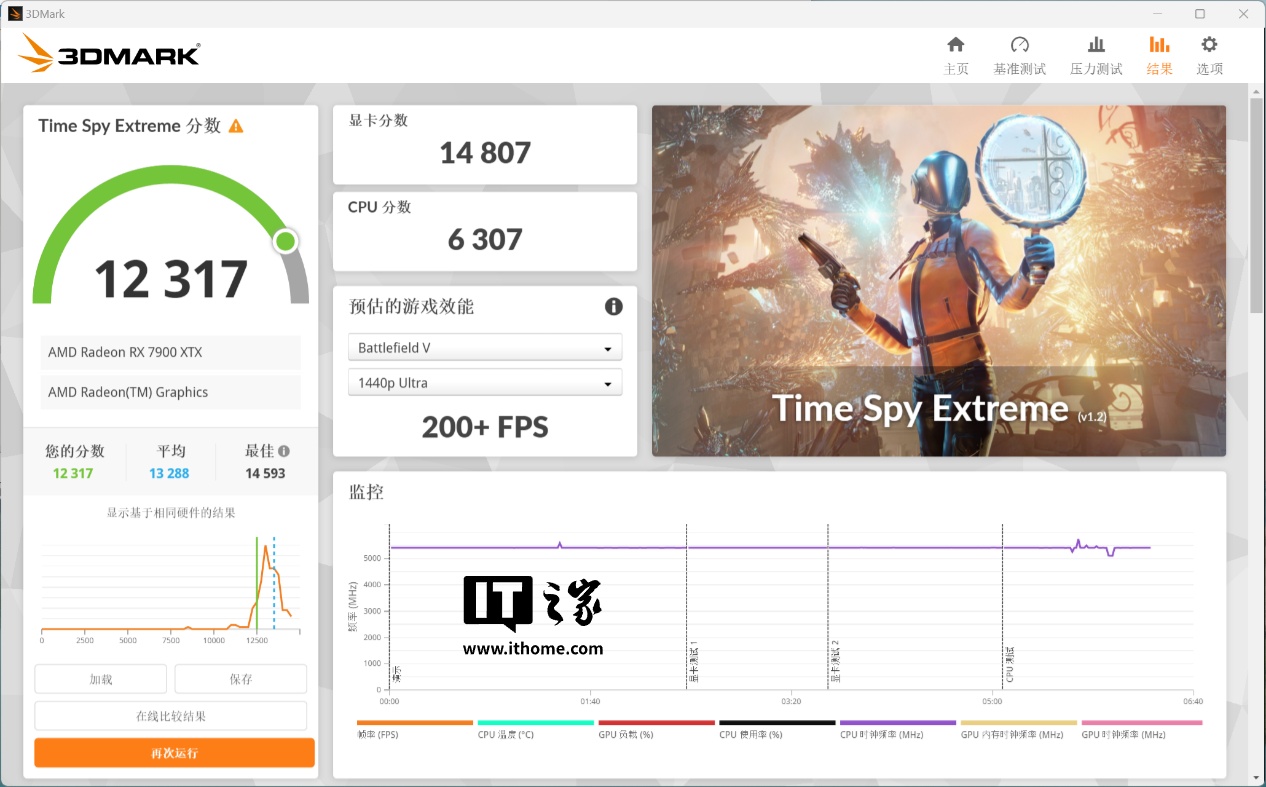 在 3D Mark Time Spy Extreme 测试项目中,则拿到了 14807 分的显卡分数,属于正常水平。
