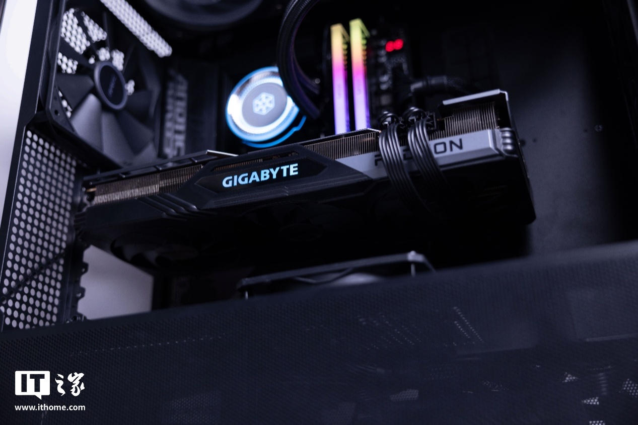 技嘉 Radeon RX 7900XTX 魔鹰显卡一侧配备了一块镜面质感,并印有 GIGABYTE Logo 标志的 RGB 灯牌,支持 1680 万色调节,也可以在技嘉智能管家中自定义灯效或灯光同步,右侧还有灰色拼接风格的 RADEON 装饰条。