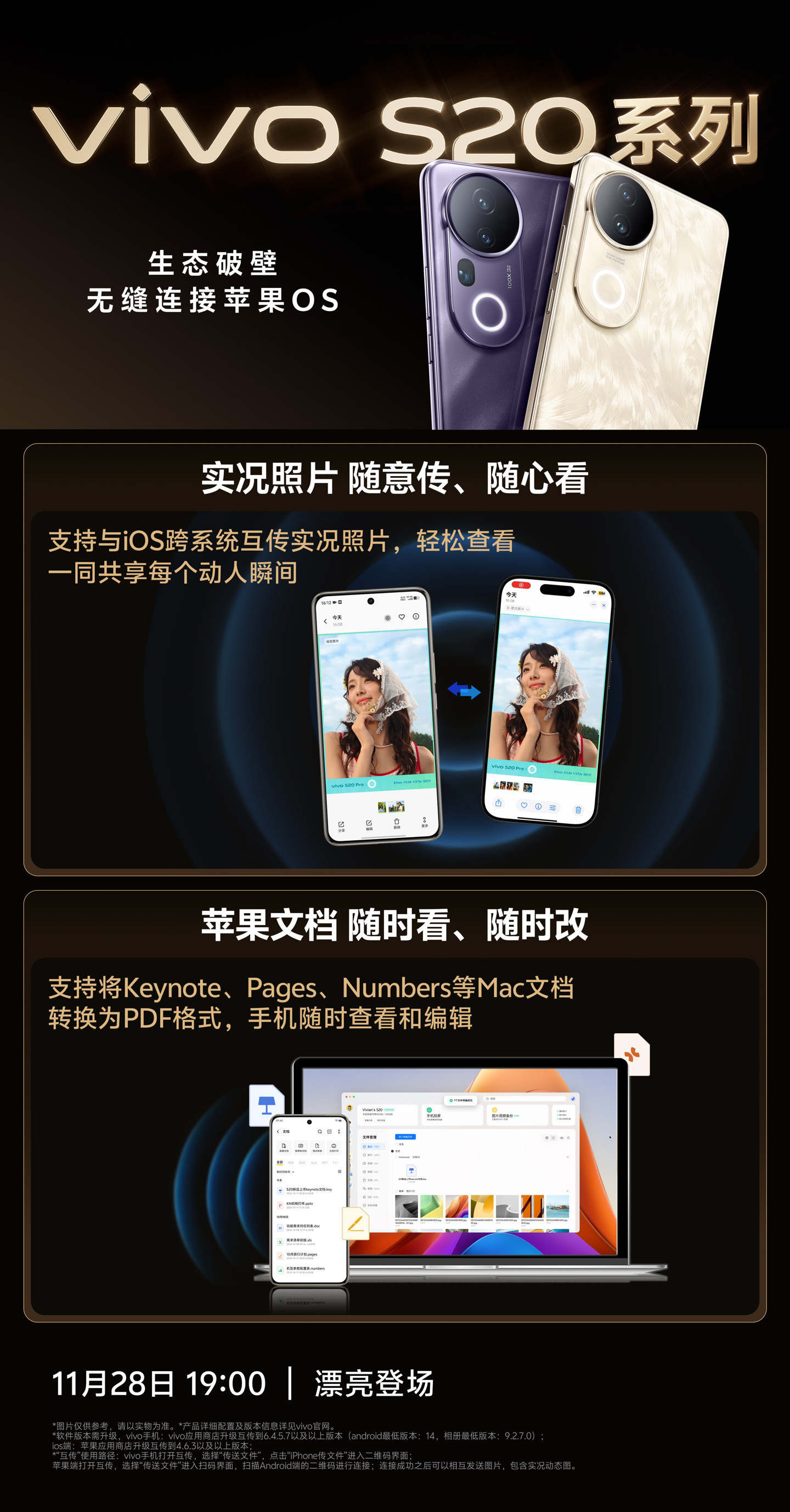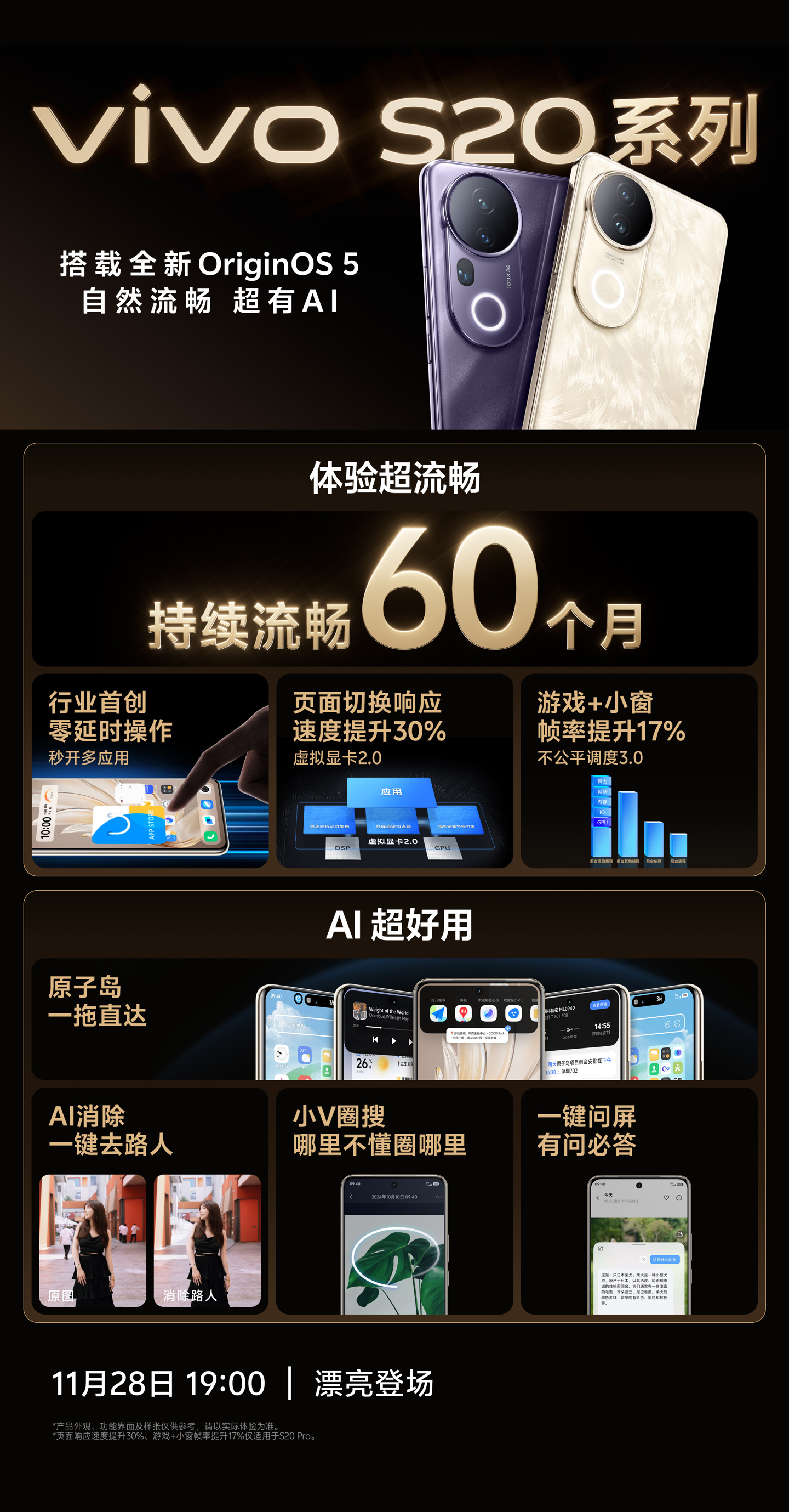 根据 vivo 官方最新预热,S20 系列手机将搭载 OriginOS 5 系统,支持原子岛、小 V 圈搜、AI 消除等功能。另外,新机还支持与 iOS 跨系统互传实况照片、苹果文档随时看随时改。