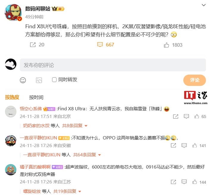 IT之家 11 月 28 日消息,博主 @数码闲聊站 今日发文透露,OPPO Find X8 Ultra 手机代号为“珠峰”,目前样机配备 2K 屏、搭载双潜望影像、拥有骁龙 8E 性能(此处预计指骁龙 8 至尊版)、采用硅电池方案。