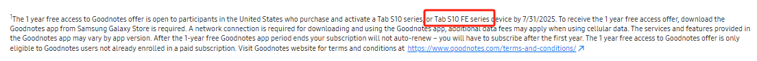 仔细阅读官网促销活动的第一个脚注,可以发现有关即将推出的 Galaxy Tab S10 FE 系列的关键信息,具体内容为:“参与美国地区促销活动的用户,在 2025 年 7 月 31 日之前购买并激活 Galaxy Tab S10 系列或 Galaxy Tab S10 FE 系列设备,即可获得一年免费 Goodnotes 使用权。”