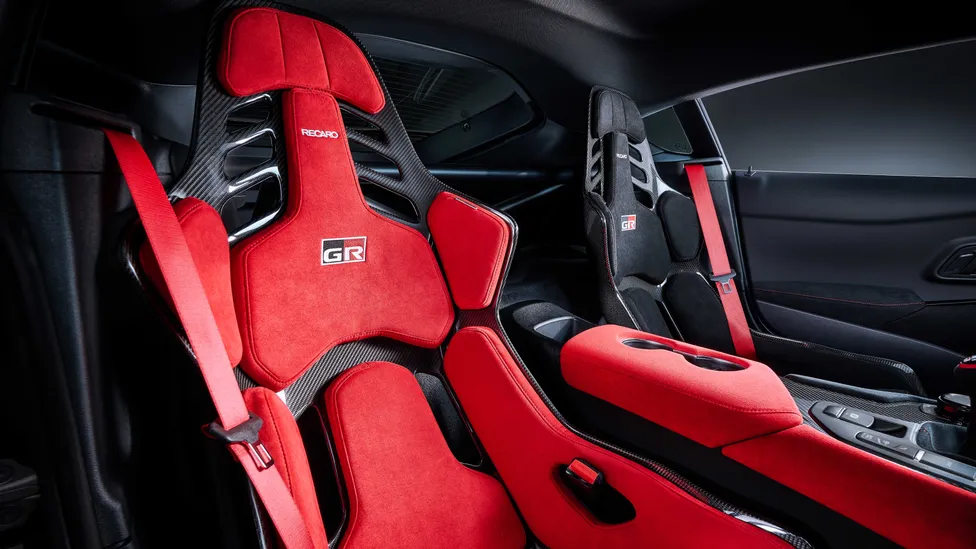 内饰方面,该车采用红色 RECARO 碳纤维桶式座椅,拥有 Alcantara 材质包裹的座椅坐垫、方向盘、车门饰板、中央扶手箱等。