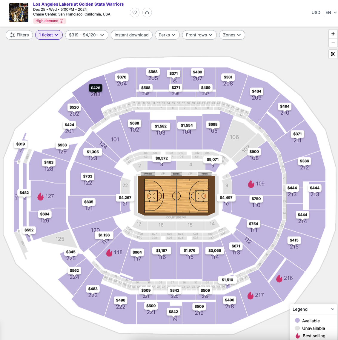 (洛杉矶湖人对金州勇士的球票售价,来源:球队官网)