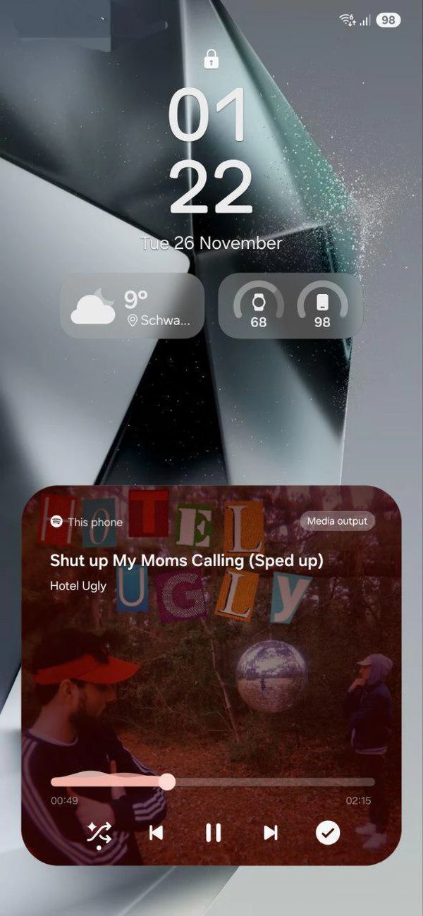 IT之家 11 月 29 日消息,消息源 @tarunvats33 昨日(11 月 28 日)在 X 平台发布推文,分享了三星 One UI 7.0 锁屏界面的相关截图,在锁屏底部可以看到全新的药丸状小部件,用于显示天气、已连接设备(如 Galaxy Watch)的电池状态,多媒体播放器等信息,并支持动态更新。