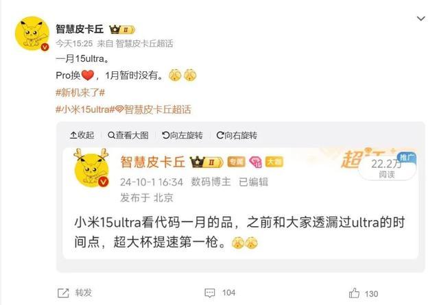 根据博主「@智慧皮卡丘」给出的信息,该机预计于明年 1 月发布。对于小米 15 Ultra 你有什么期待吗?