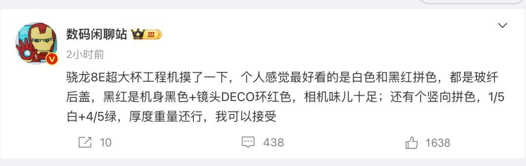 据悉,该机将拥有「白色、黑红拼色和 1/5+4/5 白绿拼色」三种配色,并且手机厚度也得到控制,后盖材质为玻璃纤维。黑红配色是机身黑色+镜头 DECO 环红色,专业相机味十足,白绿配色为竖向拼色方案。