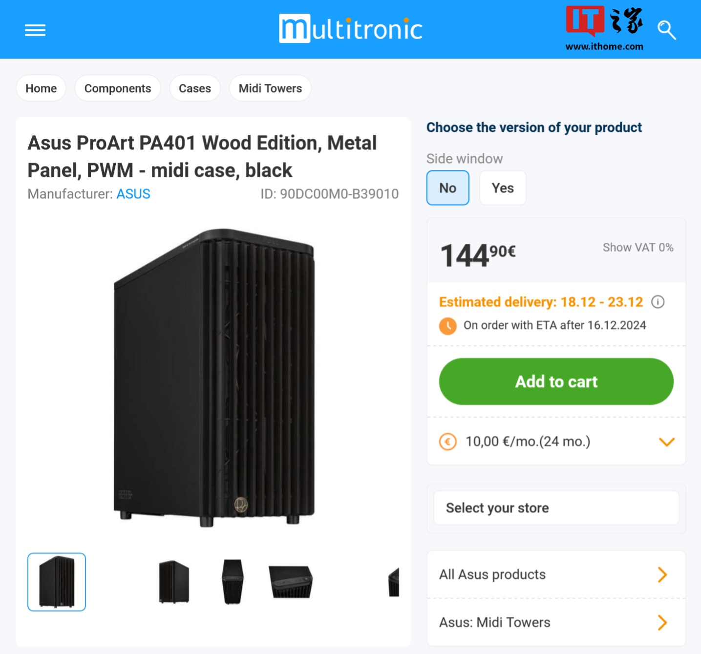 Multitronic 的商品页面显示华硕 ProArt PA401 机箱将包含左侧玻璃面板的侧透款和两侧密封面板的非侧透款两种样式,同时商品标题还提到了 Wood Edition“木艺版”,不过由于图片分辨率不佳目前无法确认各面板具体材质。