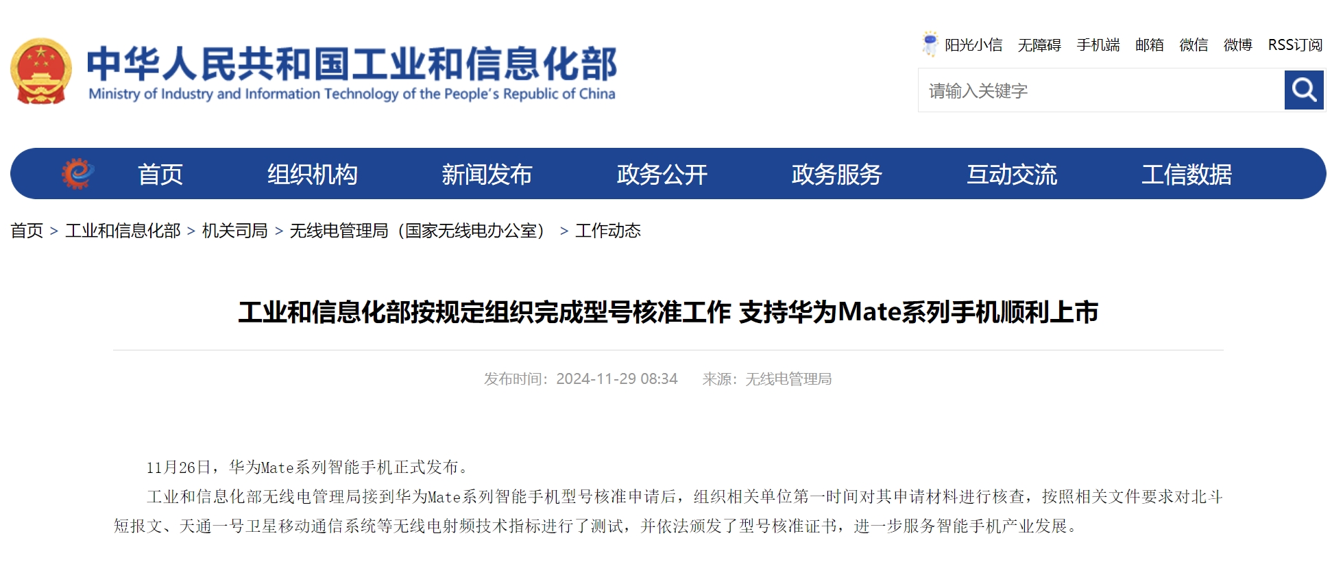 C114讯 11月29日消息(颜翊)今日,工信部发布一则工作动态,称已按规定组织完成型号核准工作,支持华为Mate系列手机顺利上市。