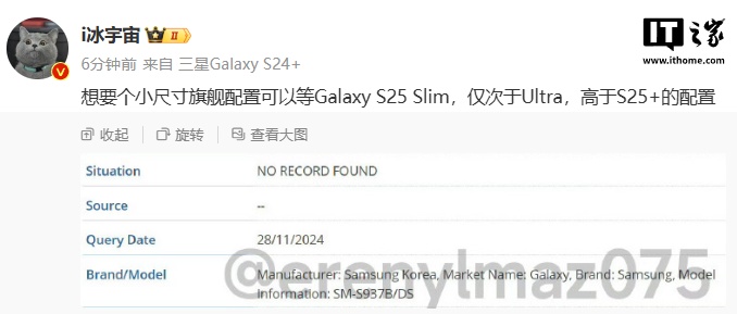 与 Galaxy Z Fold 特别版不同,Galaxy S25 Slim 将在国际上发售。X 平台博主 erenylmaz075 今日发现型号为 SM-S937B 的三星设备证实了这一点,“B”表示这是手机的全球版本。另一位博主 @i冰宇宙 则透露,这款新机采用旗舰配置,并且是仅次于 Ultra,高于 S25 + 的配置。