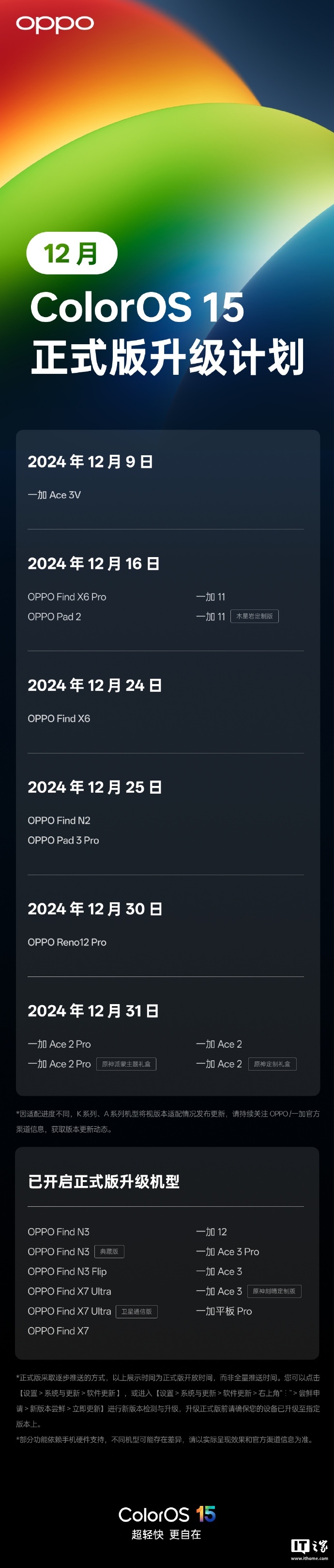 IT之家 11 月 29 日消息,OPPO 今日公布了 ColorOS 15 正式版 12 月升级计划公布,包含一加 Ace 3V、OPPO Find X6、一加 11 等 13 款机型。