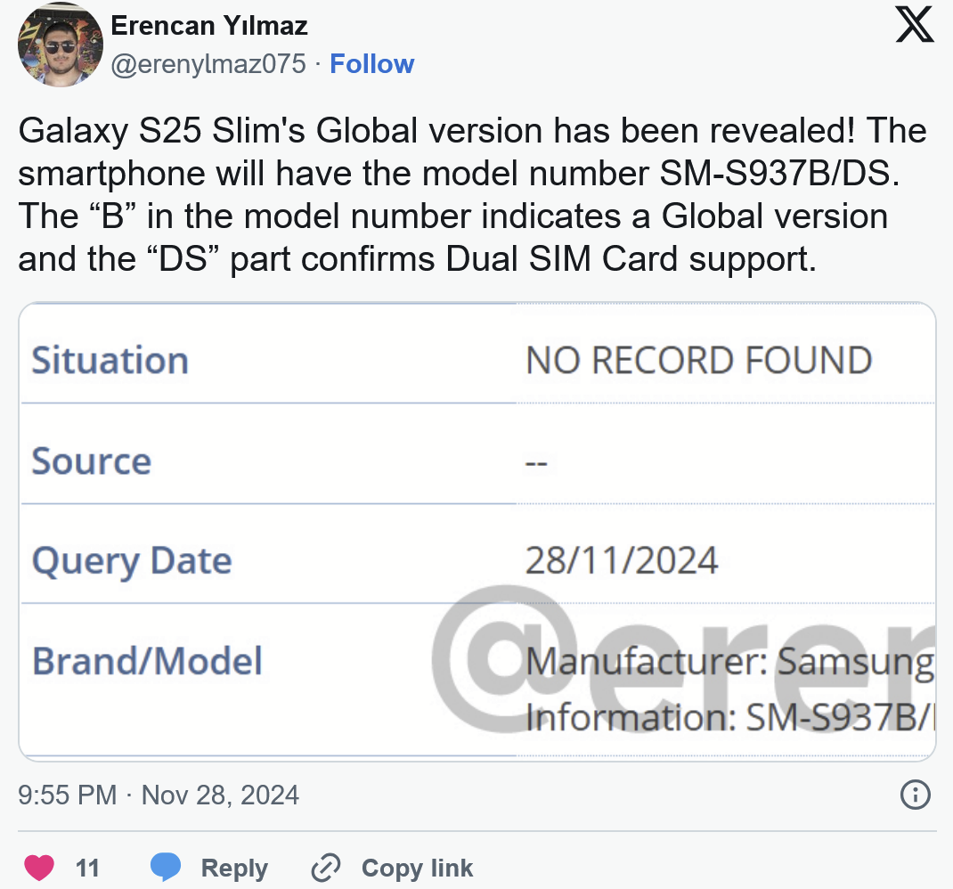 有消息称,三星正在为 Galaxy S25 Slim 的国际市场发布做准备。据 @erenylmaz075 的推文称,三星旗舰产品线的这一新成员的型号为 SM-S937B/DS。“B”可能暗示将在全球发布,而“DS”字样似乎证实了双 SIM 卡支持。
