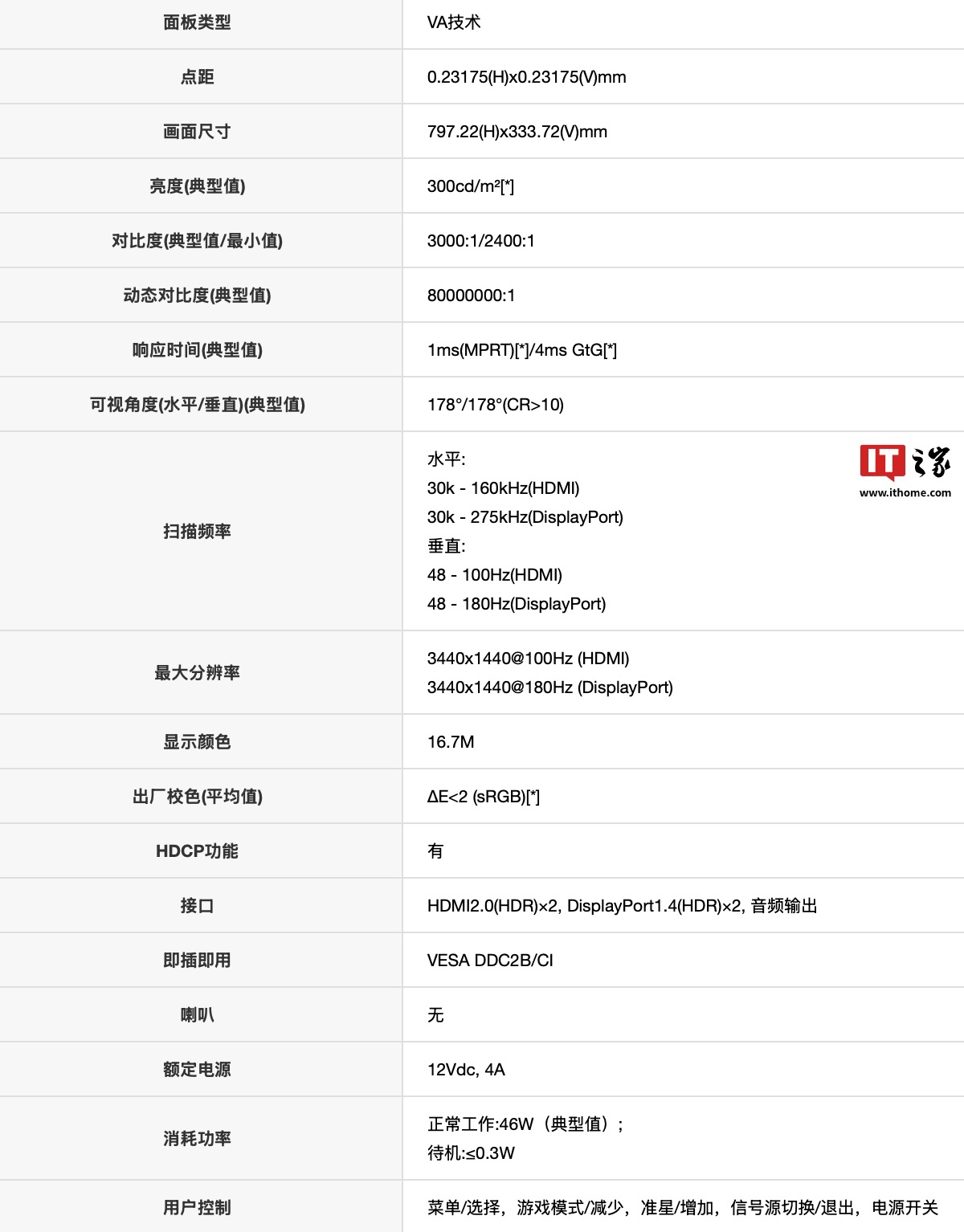 参考官网,这款“CU34G10XP”显示器配备 3440x1440 分辨率 21:9 比例 180Hz VA 面板,曲率 1500R,亮度 300 尼特,静态对比度 3000:1,响应速度 1ms,支持 8-Bit 色彩。