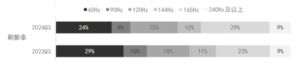 报告显示,2024年第三季度,165Hz刷新率笔记本电脑的市场份额上升至29%,而60Hz刷新率的产品市场份额则下降至24%。