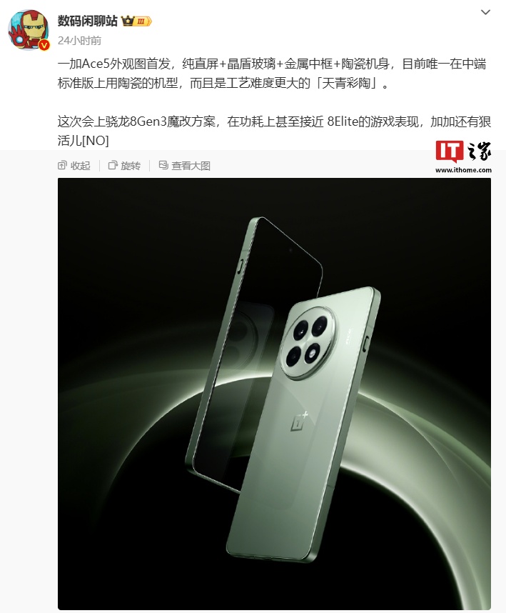 IT之家此前报道,一加计划 12 月 12 日发布 Ace 5,将采用纯直屏 + 晶盾玻璃 + 金属中框 + 陶瓷机身,是目前唯一在中端标准版上用陶瓷的机型,而且是工艺难度更大的“天青彩陶”。