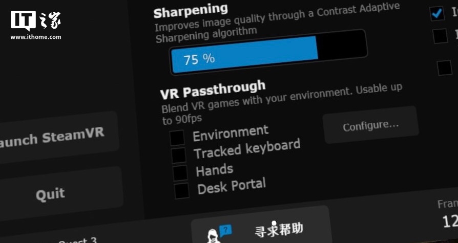 IT之家经测试获悉,这一桌面透视功能需要在设置里 VR Passthrough 选项中手动开启,可实现“场景透视(将游戏背景变为透明图层)”、“键盘透视(利用 AI 抠出场景中的键盘)”、“双手透视(利用 AI 抠出双手)”、“桌面透视(利用 AI 抠出桌面)”。