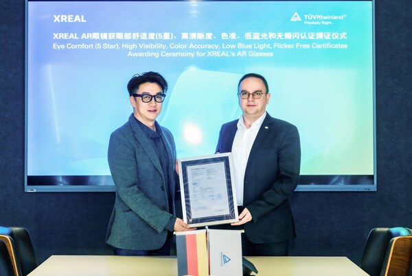 上海2024年11月29日 /美通社/ -- 11月29日,国际独立第三方检测、检验和认证机构德国莱茵TÜV大中华区(简称"TÜV莱茵")为XREAL新款AR眼镜颁发了眼部舒适度(5星)、高清晰度、色准、低蓝光和无频闪认证证书。此次一举通过五项认证,标志着XREAL在AR眼镜健康护眼和舒适体验方面取得了里程碑式的进展。