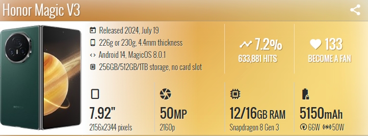 另一则数据也可以说明荣耀Magic V3在海外的热销,著名数码评测网站GSMArena的产品库中,荣耀Magic V3的关注度达633840,占整体关注度的7.2%,甚至高于moto razr 50系列,仅次于三星的两款折叠屏手机。