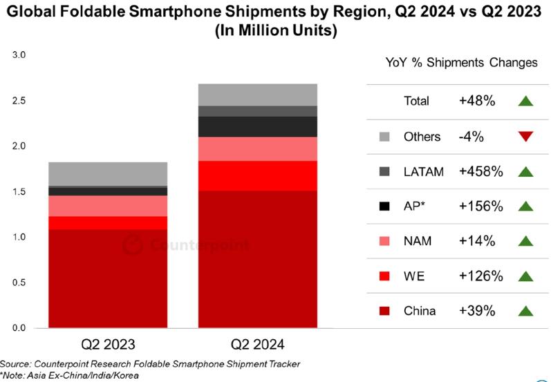 对于国产折叠手机来说,刚刚过去的2024年第三季度,或许是一个非常值得高兴的时间段。市场调查机构Counterpoint Research近日发布的一份报告显示,虽然2024年第三季度里,全球折叠屏手机的出货量在连续6个季度的同比增长后首次出现下降,但是国产品牌却全部取得了正增长,而且增长幅度相当大。