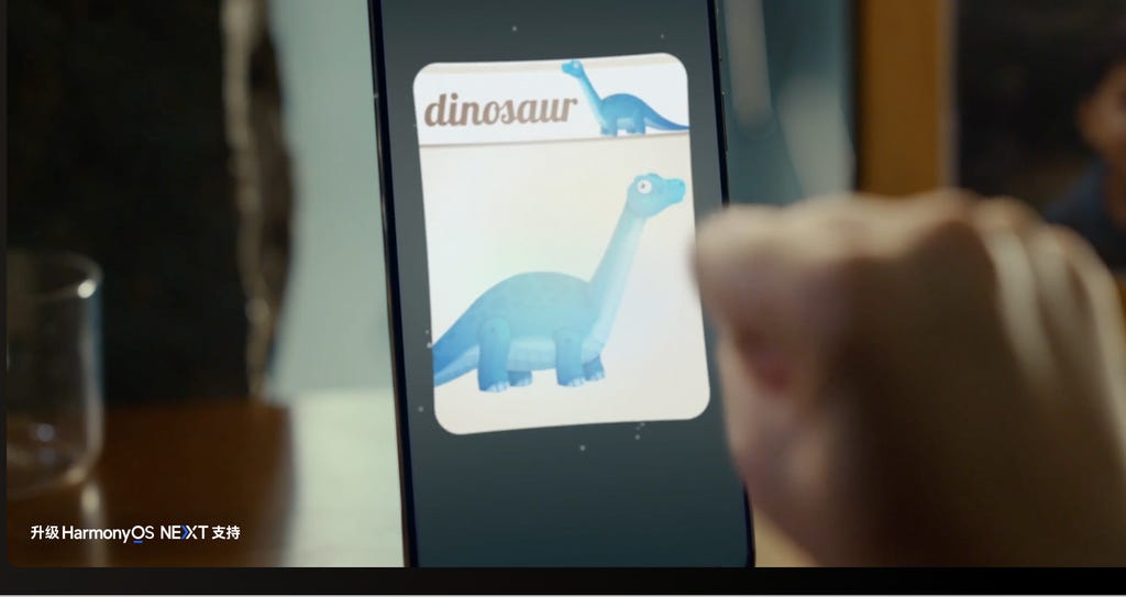 一位母亲通过手势“抓取”手机中的恐龙图片,并成功传输到儿子的华为平板上。华为/CNET截图