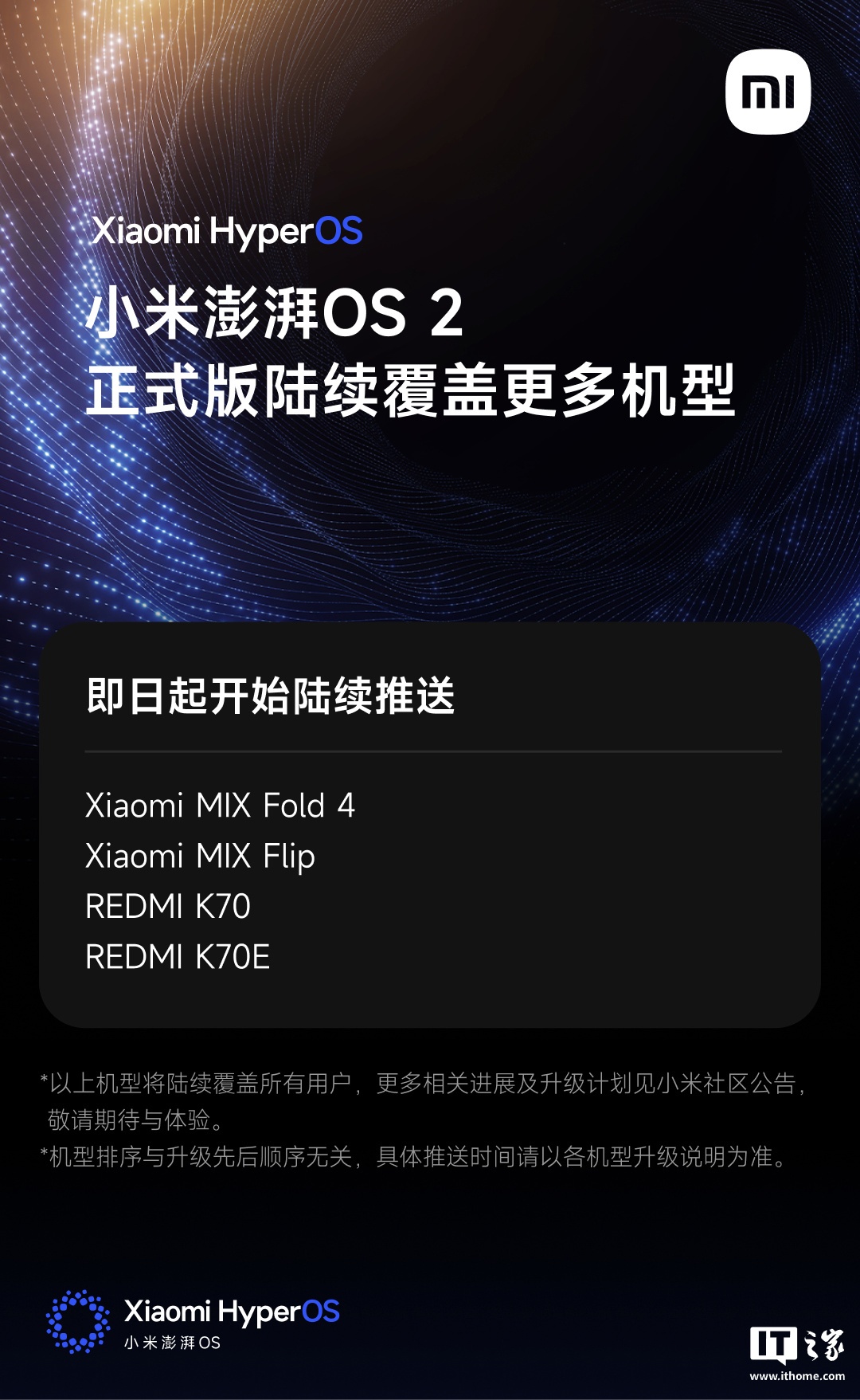 IT之家 11 月 30 日消息,小米今日宣布澎湃 OS 2 正式版覆盖更多机型,本次升级覆盖机型将从即日起开始陆续推送: