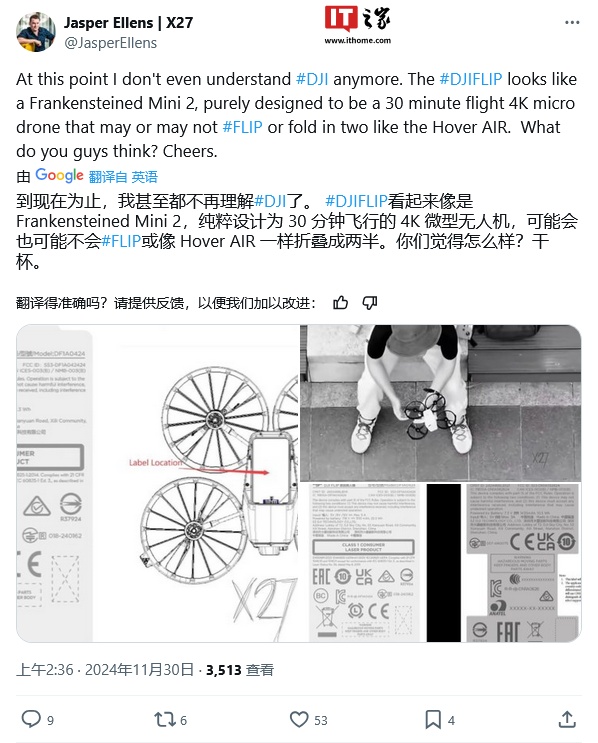 埃伦斯认为大疆现有的消费级无人机产品线已经相当丰富,包括 DJI Mini 4 Pro、DJI Mini 3、DJI Mini 4K 以及近期发布的 DJI Neo,而“DJI Flip”的出现,会让大疆产品线更加拥挤。
