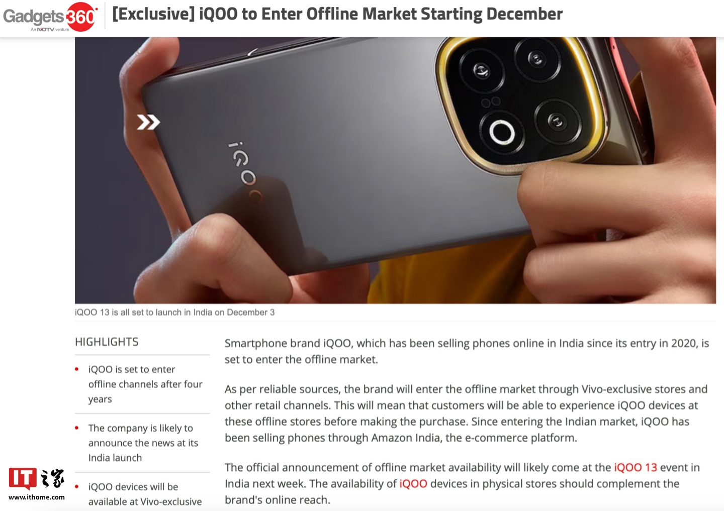 IT之家 11 月 30 日消息,iQOO 从 2020 年起开始进入印度市场,不过其一直通过官网和亚马逊线上销售产品,而根据外媒 Gadgets360 报道,iQOO 计划在下个月在印度首次利用线下渠道销售手机。